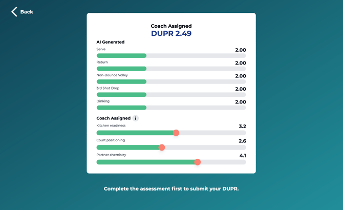 Once the assessment is completed, the score can be officially submitted and counts as your first Coach Assigned DUPR.