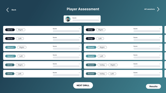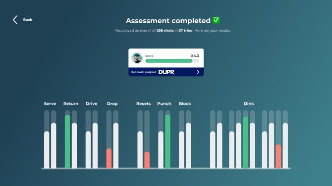 The first assessment part consists of 24 drills and takes at least 25 minutes to complete. Each drill generates an individual AI-generated score, which is then combined into 5 different DUPR skill areas: